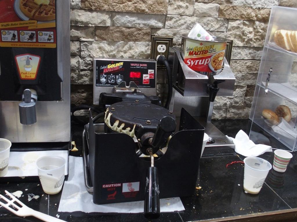 2017.07.22. Szombat Hajnalban tudtunk elaludni. A szállásunk aránylag megfelelő, bár szokni kell az amerikai viszonyokat. Az elektromos rendszer 110 voltra van tervezve, de minden eszközt, amit hoztunk, sikerült feltölteni. Öt órakor ébredtem és képtelen voltam mit kezdeni magammal. Nem akartam zavarni Patrikot egy ideig még forgolódtam az ágyban és mivel 6-tól, 9-ig van reggeli idő, elindultam reggelizni. Egy U alakú pulton tálalják az ételeket, amennyiben ezt annak lehet nevezni. Minden sütemény tetején cukorszirup, a kenyér ehetetlen, az amerikai palacsintához minden kellék adott, hogy magadnak elkészítsd, nincs gyümölcs és zöldség.