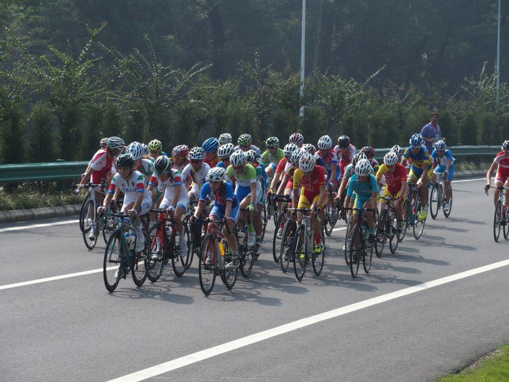 Hát eljött ez a nap is, amitől úgy rettegtem. Az országúti mezőny verseny. Ismét korán volt a rajt, ami a hangulatomat is megalapozta, így az elején rá kellett egy kicsit pörögnöm. A mezőny legvégéről sikerült rajtolnom, mert későn értem oda. Számomra meglepő módon rajt után egyből kezdődtek a ráncigálások. Az első kanyarban beigazolódtak félelmeim és közvetlen előttem sikerült egy kínai lánynak még két embert kilöknie. Innentől kezdve nem kockáztattam a bolyban tekerni. Inkább a mezőny végén haladtam, aminek meg is lett az eredménye, mert első körben szinte minden dombon leszakadtam ahol csak lehetett. Kétkedve indultam neki a második körnek, várva, hogy mikor fogok leszakadni, mert egyszer elfogy az erőm és nem tudok visszaérni a mezőnybe. Sikerült! Aztán jött a második kör egyre bátrabban mentem, helyezkedtem így sokkal kevesebb erőfeszítést igényelt a mezőnyben való haladás és a dombokon is jobban éreztem magam. A befutónál látható volt, hogy életembe nem versenyeztem még országúton. Talán jó helyezkedéssel előrébb végezhettem volna, mert elég jónak éreztem a lábaimat a sprinthez. Nem vagyok elégedetlen egyáltalán, örülök, hogy egybe beértem a célba.