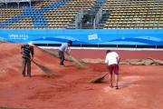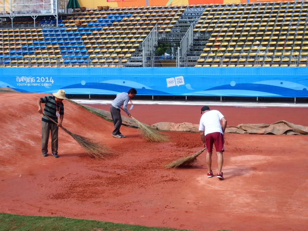 A pálya porráőrölt teniszsalakkal volt borítva és ahol a ponyva alatt megállt a víz, mély, süppedő sárrá vált.